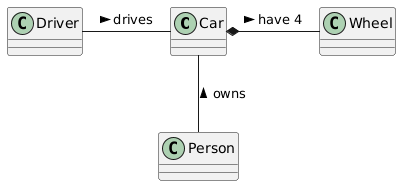 @startuml class Car Driver - Car : drives > Car *- Wheel : have 4 > Car -- Person : < owns @enduml