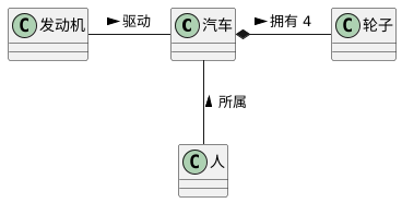 @startuml class 汽车 发动机 - 汽车 : 驱动 > 汽车 *- 轮子 : 拥有 4 > 汽车 -- 人 : < 所属 @enduml