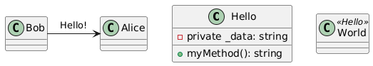 @startuml class Hello { - private _data: string + myMethod(): string } class World <<Hello>> Bob -> Alice: Hello! @enduml