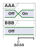 @startuml concise "AAA" as ConsiseA concise "BBB" as ConsiseB ConsiseA is "Off" ConsiseB is "Off" @0 ConsiseA is "On" caption %version() caption aaaa @enduml