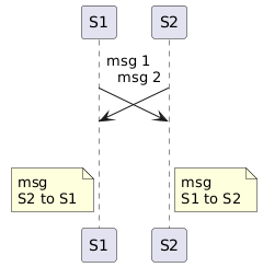 @startuml !pragma teoz true S1 ->(30) S2: msg 1\n & S2 ->(30) S1: msg 2 note left S1: msg\nS2 to S1 & note right S2: msg\nS1 to S2 @enduml