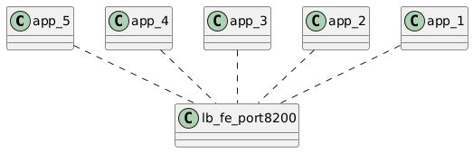 @startuml !procedure $make_clients($clients) !while $clients!=0 app_##$clients .d. lb_fe_port8200 !$clients = $clients - 1 !endwhile !endprocedure $make_clients(5) @enduml