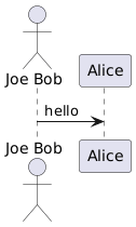 @startuml Actor "Joe Bob" "Joe Bob" -> Alice : hello @enduml