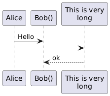 @startuml Alice -> "Bob()" : Hello "Bob()" -> "This is very\nlong" as Long ' You can also declare: ' "Bob()" -> Long as "This is very\nlong" Long --> "Bob()" : ok @enduml