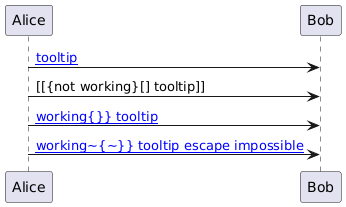 @startuml Alice -> Bob: [[{simple tooltip that works} tooltip]] Alice -> Bob: [[{not working}[] tooltip]] Alice -> Bob: [[{not working{}} tooltip]] Alice -> Bob: [[{not working~{~}} tooltip escape impossible]] @enduml