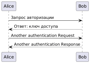 @startuml Alice -> Bob: Запрос авторизации Bob --> Alice: Ответ: ключ доступа Alice -> Bob: Another authentication Request Alice <-- Bob: Another authentication Response @enduml