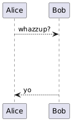@startuml Alice --> Bob: whazzup? Bob --> Alice: \n\n\n\n\n\nyo @enduml