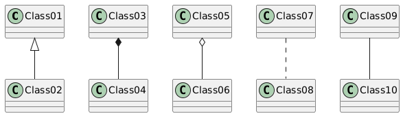 @startuml Class01 <|-- Class02 Class03 *-- Class04 Class05 o-- Class06 Class07 .. Class08 Class09 -- Class10 @enduml