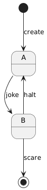 @startuml [*] --> A : create A --> B : joke B --> A : halt B --> [*] : scare @enduml