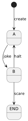 @startuml [*] --> A : create A --> B : joke B --> A : halt B --> END : scare @enduml