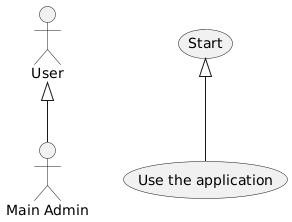 @startuml :Main Admin: as Admin (Use the application) as (Use) User <|-- Admin (Start) <|-- (Use) @enduml