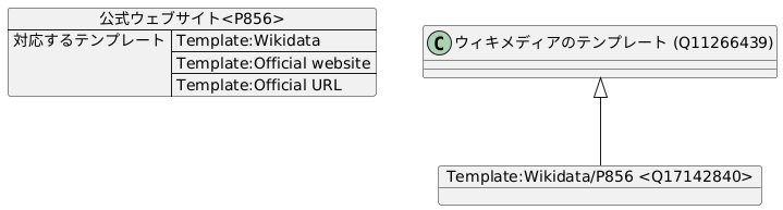 @startuml json "公式ウェブサイト<P856>" as P856 { "対応するテンプレート":["Template:Wikidata","Template:Official website","Template:Official URL"] } object "Template:Wikidata/P856 <Q17142840>" as Q17142840 { } class "ウィキメディアのテンプレート (Q11266439)" as TemplateWikimedia TemplateWikimedia <|-- Q17142840 @enduml