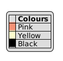 @startuml legend |= |= Colours | |<back:#F59175> </back>| Pink | |<back:#FEFECE> </back>| Yellow | |<back:#000000> </back>| Black | endlegend @enduml