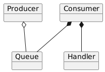 @startuml object Producer object Queue object Consumer object Handler Producer o-- Queue Consumer *-- Queue Consumer *-- Handler @enduml