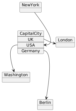 @startuml object London object Washington object Berlin object NewYork map CapitalCity { UK *-> London USA *--> Washington Germany *---> Berlin } NewYork --> CapitalCity::USA @enduml