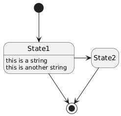 @startuml hide empty description [*] --> State1 State1 --> [*] State1 : this is a string State1 : this is another string State1 -> State2 State2 --> [*] @enduml
