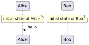 @startuml note over Alice : initial state of Alice / note over Bob : initial state of Bob Bob -> Alice : hello @enduml