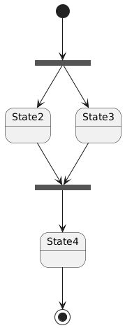 @startuml state fork_state <<fork>> [*] --> fork_state fork_state --> State2 fork_state --> State3 state join_state <<join>> State2 --> join_state State3 --> join_state join_state --> State4 State4 --> [*] @enduml