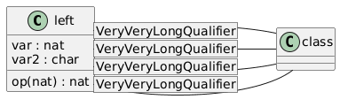 @startuml class left { var : nat var2 : char op(nat) : nat } class class left [VeryVeryLongQualifier] -right- class left [VeryVeryLongQualifier] -right- class left [VeryVeryLongQualifier] -right- class left [VeryVeryLongQualifier] -right- class @enduml
