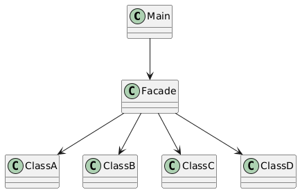 @startuml class Main { } class Facade { } class ClassA { } class ClassB { } class ClassC { } class ClassD { } Main --> Facade Facade --> ClassA Facade --> ClassB Facade --> ClassC Facade --> ClassD @enduml