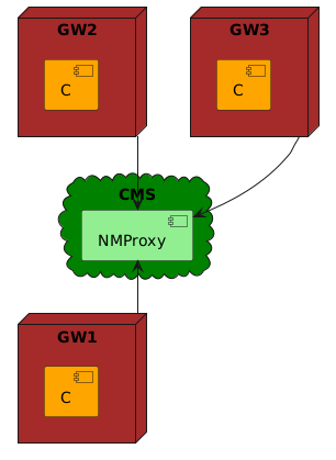 @startuml cloud CMS #green { component NMProxy #lightgreen } node GW1 #brown { component "C" as C1 #orange } node GW2 #brown { component "C" as C2 #orange } node GW3 #brown { component "C" as C3 #orange } GW1 -u-> NMProxy GW2 -d-> NMProxy GW3 -d-> NMProxy @enduml