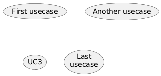 @startuml (First usecase) (Another usecase) as (UC2) usecase UC3 usecase (Last\nusecase) as UC4 @enduml