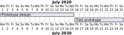 @startgantt Project starts 2020-07-01 [Prototype design] starts 2020-07-01 [Test prototype] starts 2020-07-16 [Prototype design] ends 2020-07-15 [Test prototype] ends 2020-07-25 @endgantt
