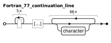@startebnf Fortran_77_continuation_line = 5 * " ", '[...]', 66 * [character]; @endebnf