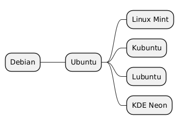 @startmindmap # Debian ## Ubuntu ### Linux Mint ### Kubuntu ### Lubuntu ### KDE Neon @endmindmap