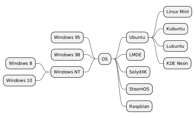 @startmindmap + OS ++ Ubuntu +++ Linux Mint +++ Kubuntu +++ Lubuntu +++ KDE Neon ++ LMDE ++ SolydXK ++ SteamOS ++ Raspbian -- Windows 95 -- Windows 98 -- Windows NT --- Windows 8 --- Windows 10 @endmindmap