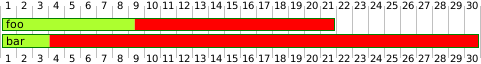 @startgantt <style> ganttDiagram { task { BackGroundColor GreenYellow LineColor Green } undone { BackGroundColor red } } </style> [foo] lasts 21 days [foo] is 40% completed [bar] lasts 30 days and is 10% complete @endgantt