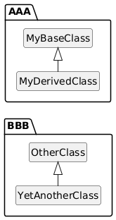 @startuml left to right direction hide circle hide empty members namespace BBB { class OtherClass { } class YetAnotherClass { } OtherClass <|-left- YetAnotherClass } namespace AAA { class MyBaseClass { } class MyDerivedClass { } MyBaseClass <|-left- MyDerivedClass } 'AAA -> BBB @enduml