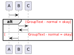 @startuml <style> sequenceDiagram { group { FontColor red FontStyle normal } } </STYLE> A -> B alt GroupText - normal = okay C <- B B <- C else \t\t\tGroupText - normal = okay A <- B end @enduml