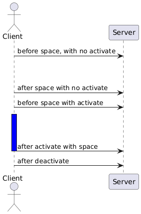 @startuml actor Client participant Server Client->Server: before space, with no activate ||45|| Client->Server: after space with no activate Client->Server: before space with activate -[hidden]> Client ||45|| activate Client #blue Client->Server: after activate with space deactivate Client Client->Server: after deactivate @enduml