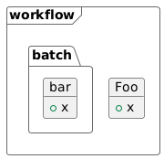 @startuml allowmixing skinparam backgroundcolor transparent !theme vibrant frame "workflow" { package "batch" as p { object bar } object "Foo" as bar { + x } object "Foo" as baz { + x } } @enduml