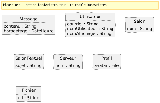 @startuml skinparam style strictuml skinparam backgroundcolor transparent skinparam defaultfontname xkcd Script skinparam handwritten true scale 1 hide empty members class Message { contenu : String horodatage : DateHeure } class Utilisateur { courriel : String nomUtilisateur : String nomAffichage : String } class Salon { nom : String } class SalonTextuel { sujet : String } class Serveur { nom : String } class Profil { avatar : File } class Fichier { url : String } @enduml