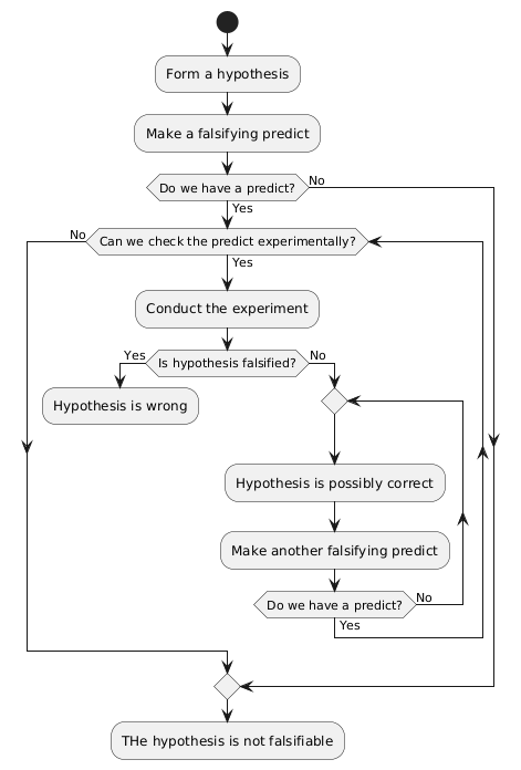 @startuml start :Form a hypothesis; :Make a falsifying predict; if (Do we have a predict?) then (Yes) while (Can we check the predict experimentally?) is (Yes) :Conduct the experiment; if (Is hypothesis falsified?) then (Yes) :Hypothesis is wrong; kill else (No) repeat :Hypothesis is possibly correct; :Make another falsifying predict; repeat while (Do we have a predict?) is (No) not (Yes) endif endwhile (No) /'This'/ else (No) /'And this'/ endif :THe hypothesis is not falsifiable; kill @enduml
