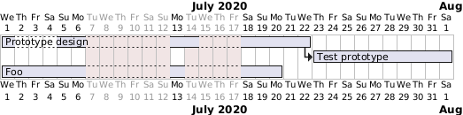 @startgantt 2020-07-07 to 2020-07-17 are closed 2020-07-13 is open 2020-07-14 is open for [Prototype design] 2020-07-2 to 2020-07-4 are closed for [Prototype design] Project starts the 2020-07-01 [Prototype design] lasts 10 days Then [Test prototype] lasts 10 days [Foo] lasts 10 days @endgantt