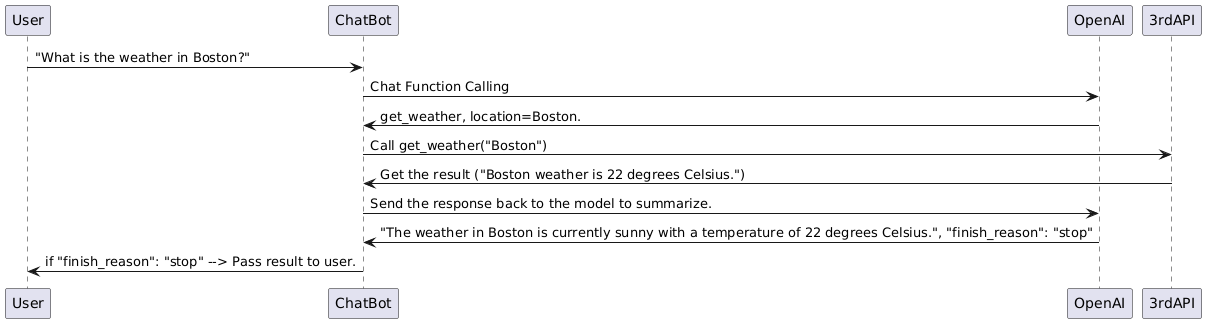 @startuml User -> ChatBot: "What is the weather in Boston?" ChatBot -> OpenAI: Chat Function Calling OpenAI -> ChatBot: get_weather, location=Boston. ChatBot -> 3rdAPI: Call get_weather("Boston") 3rdAPI -> ChatBot: Get the result ("Boston weather is 22 degrees Celsius.") ChatBot -> OpenAI: Send the response back to the model to summarize. OpenAI -> ChatBot: "The weather in Boston is currently sunny with a temperature of 22 degrees Celsius.", "finish_reason": "stop" ChatBot -> User: if "finish_reason": "stop" --> Pass result to user. @enduml