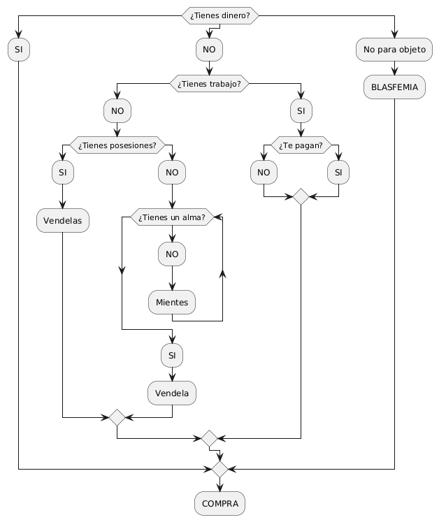 @startuml switch (¿Tienes dinero?) case () :SI; case () :NO; if (¿Tienes trabajo?) then :NO; if (¿Tienes posesiones?) then :SI; :Vendelas; else :NO; while (¿Tienes un alma?) :NO; :Mientes; endwhile :SI; :Vendela; endif else :SI; if (¿Te pagan?) then :NO; 'goto (¿Tienes posesiones?) else :SI; endif endif case () :No para objeto; :BLASFEMIA; endswitch :COMPRA; @enduml