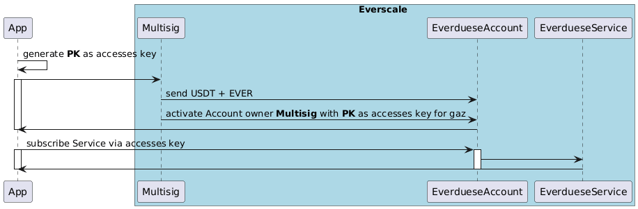 @startuml participant App as A box Everscale #LightBlue participant Multisig as M participant EverdueseAccount as MA participant EverdueseService as MS end box A -> A: generate **PK** as accesses key A -> M activate A M -> MA: send USDT + EVER M -> MA: activate Account owner **Multisig** with **PK** as accesses key for gaz MA -> A deactivate A A -> MA: subscribe Service via accesses key activate A activate MA MA -> MS MS -> A deactivate MA deactivate A @enduml