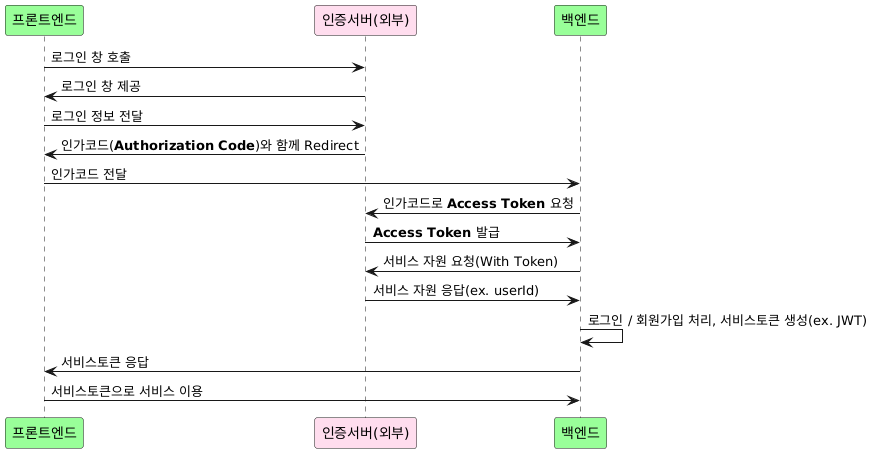 @startuml Participant "프론트엔드" as FE #99FF99 Participant "인증서버(외부)" as AS #ffddee Participant "백엔드" as BE #99FF99 FE -> AS : 로그인 창 호출 AS -> FE : 로그인 창 제공 FE -> AS : 로그인 정보 전달 AS -> FE : 인가코드(**Authorization Code**)와 함께 Redirect FE -> BE : 인가코드 전달 BE -> AS : 인가코드로 **Access Token** 요청 AS -> BE : **Access Token** 발급 BE -> AS : 서비스 자원 요청(With Token) AS -> BE : 서비스 자원 응답(ex. userId) BE -> BE : 로그인 / 회원가입 처리, 서비스토큰 생성(ex. JWT) BE -> FE : 서비스토큰 응답 FE -> BE : 서비스토큰으로 서비스 이용 @enduml