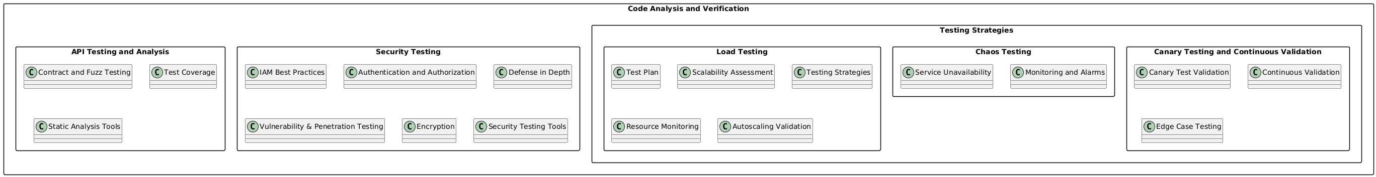 @startuml skinparam packageStyle rectangle skinparam linetype ortho package "Code Analysis and Verification" { package "API Testing and Analysis" { class "Contract and Fuzz Testing" class "Test Coverage" class "Static Analysis Tools" } package "Security Testing" { class "IAM Best Practices" class "Authentication and Authorization" class "Defense in Depth" class "Vulnerability & Penetration Testing" class "Encryption" class "Security Testing Tools" } ' Empty line for visual separation package "Testing Strategies" { package "Load Testing" { class "Test Plan" class "Scalability Assessment" class "Testing Strategies" class "Resource Monitoring" class "Autoscaling Validation" } package "Chaos Testing" { class "Service Unavailability" class "Monitoring and Alarms" } package "Canary Testing and Continuous Validation" { class "Canary Test Validation" class "Continuous Validation" class "Edge Case Testing" } } } @enduml
