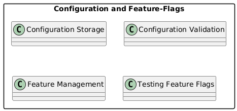 @startuml skinparam packageStyle rectangle skinparam linetype ortho package "Configuration and Feature-Flags" { class "Configuration Storage" class "Configuration Validation" class "Feature Management" class "Testing Feature Flags" } @enduml