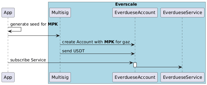 @startuml participant App as A box Everscale #LightBlue participant Multisig as M participant EverdueseAccount as MA participant EverdueseService as MS end box A -> A: generate seed for **MPK** A -> M M -> MA: create Account with **MPK** for gaz M -> MA: send USDT A -> MA: subscribe Service activate MA MA -> MS deactivate MA @enduml