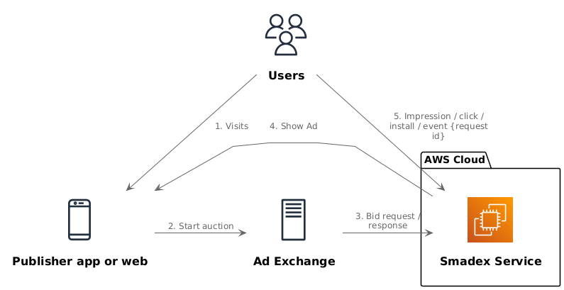 @startuml !include <awslib/AWSCommon> !include <aws/common> !include <awslib/AWSSimplified.puml> !include <awslib/Compute/all.puml> !include <awslib/General/all.puml> !include <awslib/GroupIcons/all.puml> skinparam linetype polyline ' skinparam linetype ortho package "AWS Cloud" { EC2(Smadex, "Smadex Service", " ") } Users(Users, "Users", " ") Traditionalserver(AdExchange, "Ad Exchange", " ") Mobileclient(Mobile, "Publisher app or web", " ") Users -down-> Mobile: 1. Visits Mobile -right-> AdExchange: 2. Start auction AdExchange -right-> Smadex: 3. Bid request / response Smadex -left-> Mobile: 4. Show Ad Users -right-> Smadex: 5. Impression / click / install / event {request id} @enduml