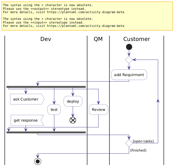 @startuml skinparam DefaultFontName "Lucida Sans Typewriter" skinparam Activity{ BackgroundColor snow BorderColor DarkSlateBlue DiamondBackgroundColor ghostwhite DiamondBorderColor DarkSlateBlue } skinparam Note{ BorderColor DarkSlateBlue BackgroundColor LightYellow } skinparam ArrowColor DarkSlateBlue |Dev| |QM| |Customer| start repeat :add Requirment; |Dev| fork |QM| :Review; |Dev| fork again :ask Customer> Detach :get response< fork again :test; fork again :deploy; end |Dev| end fork |Customer| repeat while () is ([open tasks]) ->[finished]; |Dev| stop @enduml