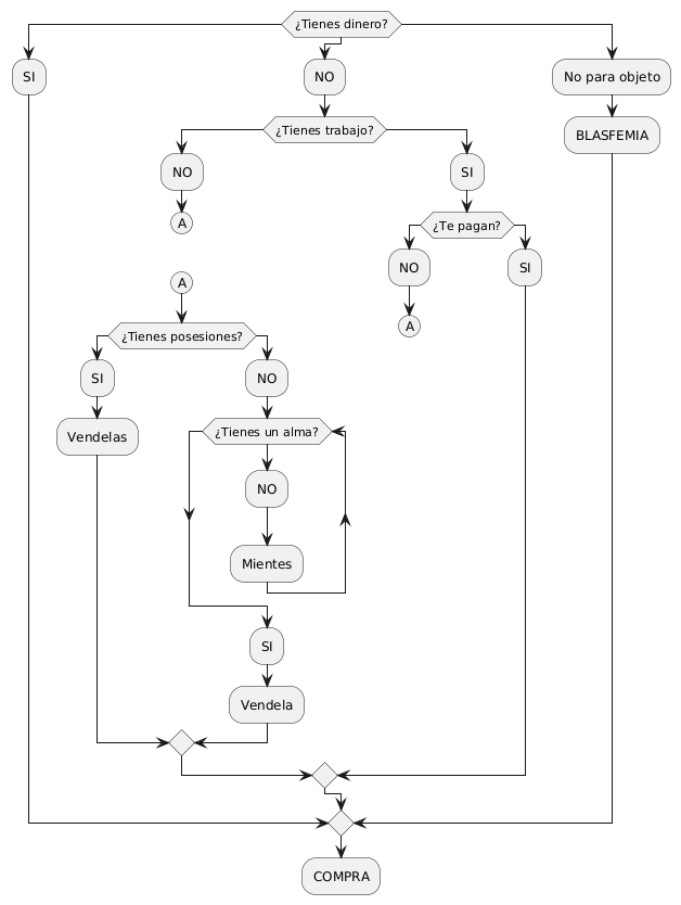@startuml switch (¿Tienes dinero?) case () :SI; case () :NO; if (¿Tienes trabajo?) then :NO; (A); detach (A) if (¿Tienes posesiones?) then :SI; :Vendelas; else :NO; while (¿Tienes un alma?) :NO; :Mientes; endwhile :SI; :Vendela; endif else :SI; if (¿Te pagan?) then :NO; (A); detach; 'goto (¿Tienes posesiones?) else :SI; endif endif case () :No para objeto; :BLASFEMIA; endswitch :COMPRA; @enduml