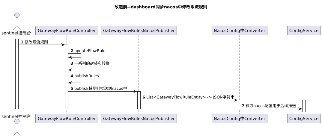 @startuml title 改造前--dashboard同步nacos中修改限流规则 actor "sentinel控制台" as dashboard participant "GatewayFlowRuleController" as ruleCtl participant "GatewayFlowRulesNacosPublisher" as rulePub participant "NacosConfig中Converter" as cvt participant "ConfigService" as configSer autonumber activate dashboard dashboard-> ruleCtl: 修改限流规则 activate ruleCtl ruleCtl-> ruleCtl: updateFlowRule ruleCtl-> ruleCtl: 一系列的封装和转换 ruleCtl-> ruleCtl: publishRules ruleCtl-> rulePub: publish将规则推送到nacos中 activate rulePub rulePub-> cvt: List<GatewayFlowRuleEntity> -> JSON字符串 activate cvt activate configSer cvt-> configSer: 获取nacos配置用于后续推送 deactivate cvt deactivate rulePub deactivate ruleCtl deactivate dashboard @enduml