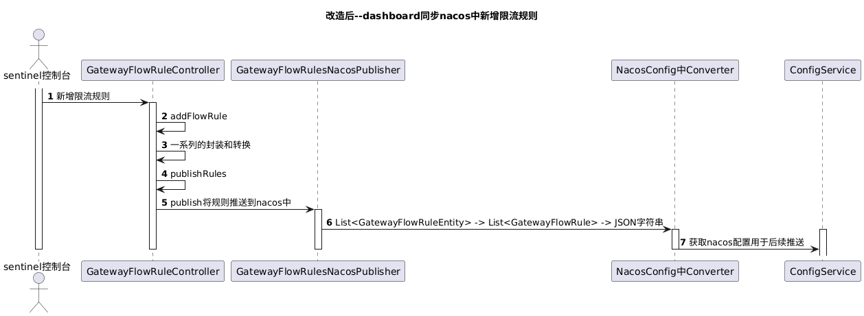 @startuml title 改造后--dashboard同步nacos中新增限流规则 actor "sentinel控制台" as dashboard participant "GatewayFlowRuleController" as ruleCtl participant "GatewayFlowRulesNacosPublisher" as rulePub participant "NacosConfig中Converter" as cvt participant "ConfigService" as configSer autonumber activate dashboard dashboard-> ruleCtl: 新增限流规则 activate ruleCtl ruleCtl-> ruleCtl: addFlowRule ruleCtl-> ruleCtl: 一系列的封装和转换 ruleCtl-> ruleCtl: publishRules ruleCtl-> rulePub: publish将规则推送到nacos中 activate rulePub rulePub-> cvt: List<GatewayFlowRuleEntity> -> List<GatewayFlowRule> -> JSON字符串 activate cvt activate configSer cvt-> configSer: 获取nacos配置用于后续推送 deactivate cvt deactivate rulePub deactivate ruleCtl deactivate dashboard @enduml